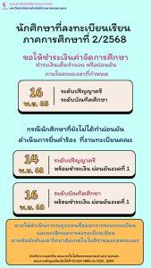 ข่าวประชาสัมพันธ์ นักศึกษาที่ลงทะเบียนเรียน ภาคการศึกษาที่ 2/2568 Posted พฤศจิกายน 5, 2025 Admin_academic2 ขอให้ชำระเงินค่าจัดการศึกษา ภายในระยะเวลาที่กำหนด